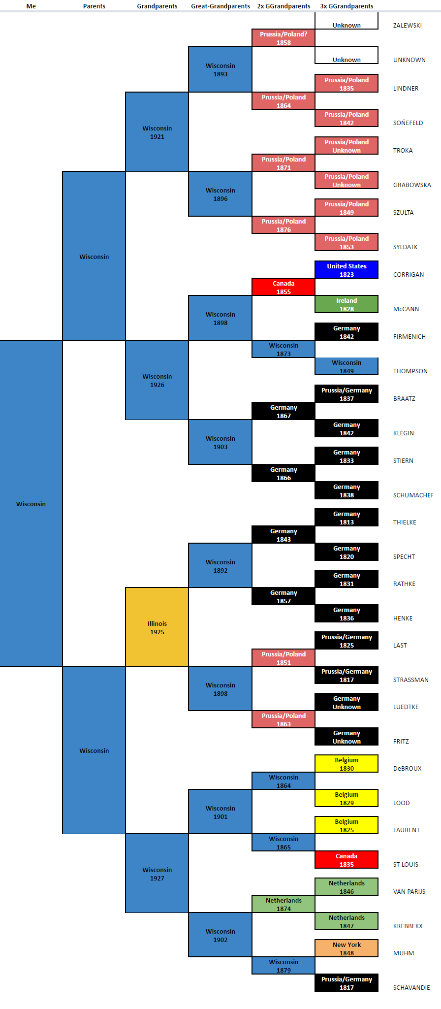 It was neat to see all of the birth locations of my ancestors back to my 3rd great-grandparents all in once place. Only 2 “Unknown” entries, which is pretty good (on my surname line, of all places.) I also always assumed my maternal line has been in Wisconsin the longest since they arrived in the early 1850s. It actually looks like one of my paternal ancestors, Pauline (THOMPSON) Firmenich was born in Wisconsin in 1849, only one year after it became an official state.