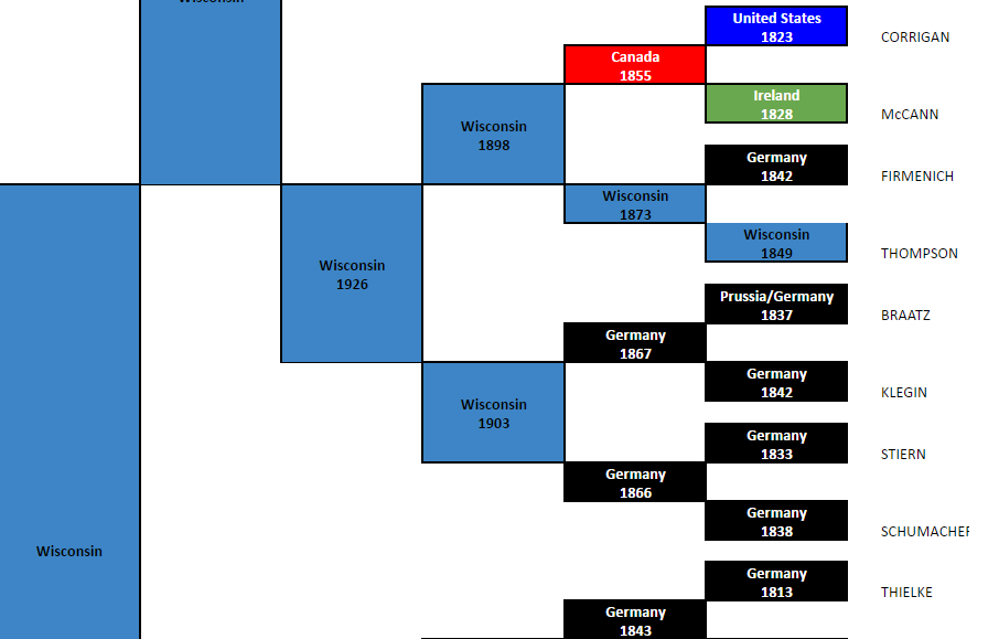 Back to my great-grandparents, all of my ancestors were born in Wisconsin, with the exception of my grandfather. He was born in Chicago when my great-grandparents lived there for a few years in the 1920s. My earliest US ancestor is my 3rd great-grandfather, William CORRIGAN, who was born somewhere in the US in 1823. It is assumed probably New York, but we’re not sure. They stopped in that area before continuing on to Canada.