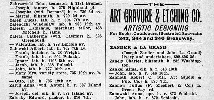 Jacob is now listed again, but this time down the street at 338 Pulaski. I’m not sure who Frank is renting from since Jacob has moved out. Again, the Zalewski list is much longer than 1894 and back to 1893 length. It seems that 1894 had a weird glitch.