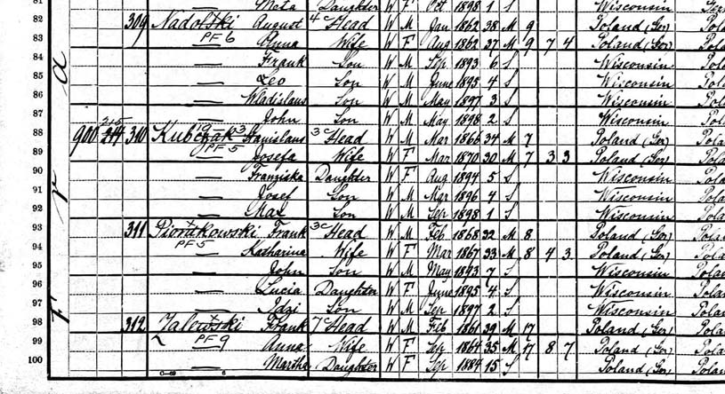 The 1900 US Census shows Frank and his family living at 900 Fratney. Again, the house is considered a “polish flat” so there are multiple families living here, all Polish. The rest of the family is located on the next page, which now includes all of their children except Agnes, who was born in 1902. Frank is listed as a “Day Laborer.”