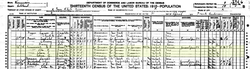 This is Mathias’ first census listing without his wife Paulina, who died sometime before the enumeration on 30 Apr 1910. Three of his youngest daughters still live with him. He is listed as living in White River, which is near Sanborn and Ashland. This is either his normal Sanborn location (but enumerated as White River), or he moved a bit to the northeast.