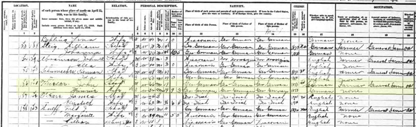 I’m not sure if they still live in the same location as the previous census records as there were no streets or addresses in that area in 1910. The names of their neighbors indicate that this is probably the same location as before. The names match up with neighbors on the 1892 Plat Map. This record shows incorrect immigration dates for both Minnie and Johann with 1873. This is wrong since Johann was listed in census records from 1860 and there is an 1887 passenger list with Minnie included on it.