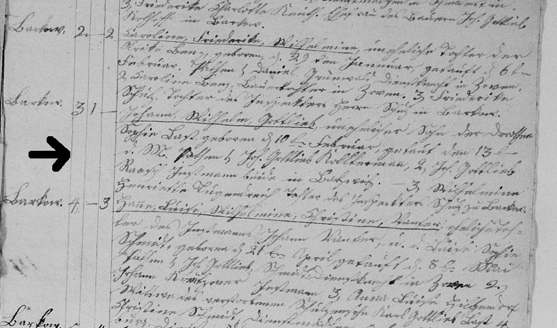 Then, on the first page of the 1825 baptism records for the parish of Barkow, I spotted what looked like “Johann Wilhelm Gottlieb,” his full name from his marriage record. Unfortunately, it seems that Johann is listed as uneheliche sohn which basically translates to “illegitimate son.” It does list his mother as Dorothea Sophia LAST, but no father. I know that some church records sometimes have a “legitimacy” section that has listings for when they legitimize the children, so I’m hoping it’s there.