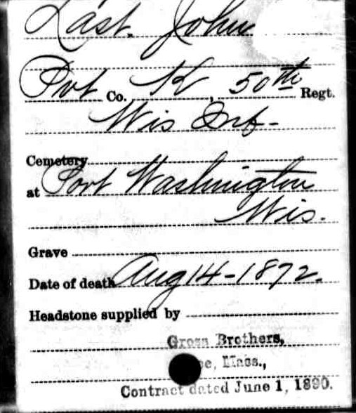 For the longest time, I had no idea when John Last died. All of a sudden he just disappears from the census records. I know he didn’t die in the Civil War since he is back with his family in 1870. Then, I came across this listing of headstones that were donated to war veterans. In it, I found John Last’s entry with his death date, August 14, 1872.