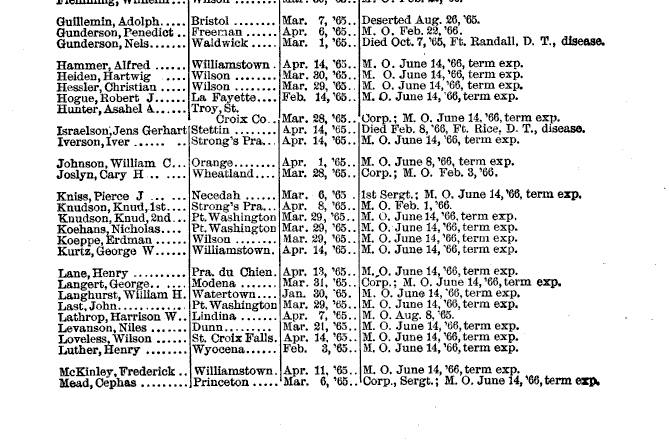 Organized at Madison, Wis., March and April, 1865. Moved to St. Louis, Mo., thence from Benton Barracks (skirmishes near Booneville, Mo., May 3, 1865, Detachment) to Fort Leavenworth, Kan., and to Fort Rice, D.T. Duty there until May, 1866. Mustered out April 19 to June 12, 1863. – The Civil War Archive