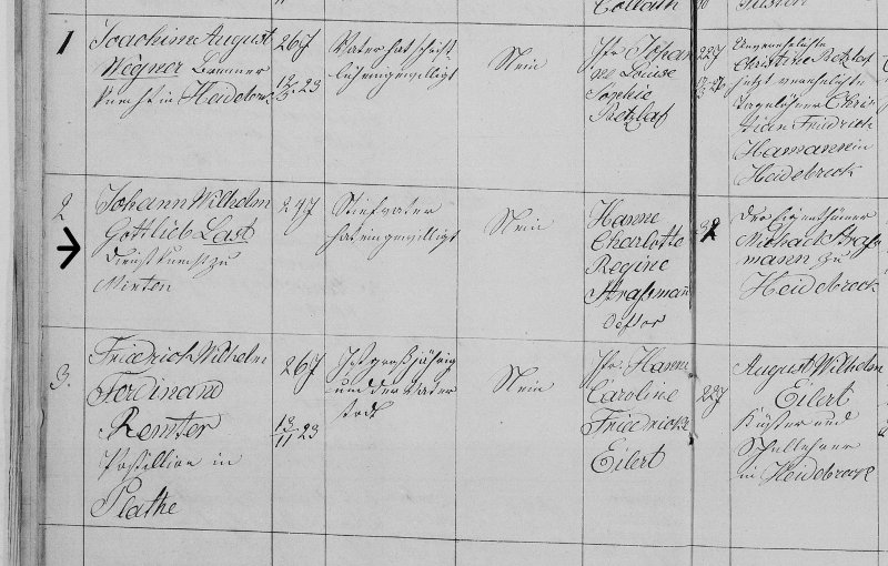 Underneath Charlotte’s name, it says, “Deflor” which translates in latin to “deflorata” or “deflowered.” I’m hoping it means she was previously married since “deflorata” roughly translates into English as “ravished” which, to put it bluntly, means “raped.” According to some research, the term “Deflor” may not be used in negative connotation, but just noting that this husband was not her first “partner.” A few pages back in the records, there is a listing for the birth of a daughter of Charlotte named “Ulrike Auguste Amalie” but no father, just a location “Heydebreck.” I’m not sure if she was born illegitimately or if the father had died. It makes me wonder if this daughter is “Augusta”, the first daughter listed for Johann and Charlotte in the passenger lists and also the census records since she would’ve only been 4 months old at the time of their marriage.