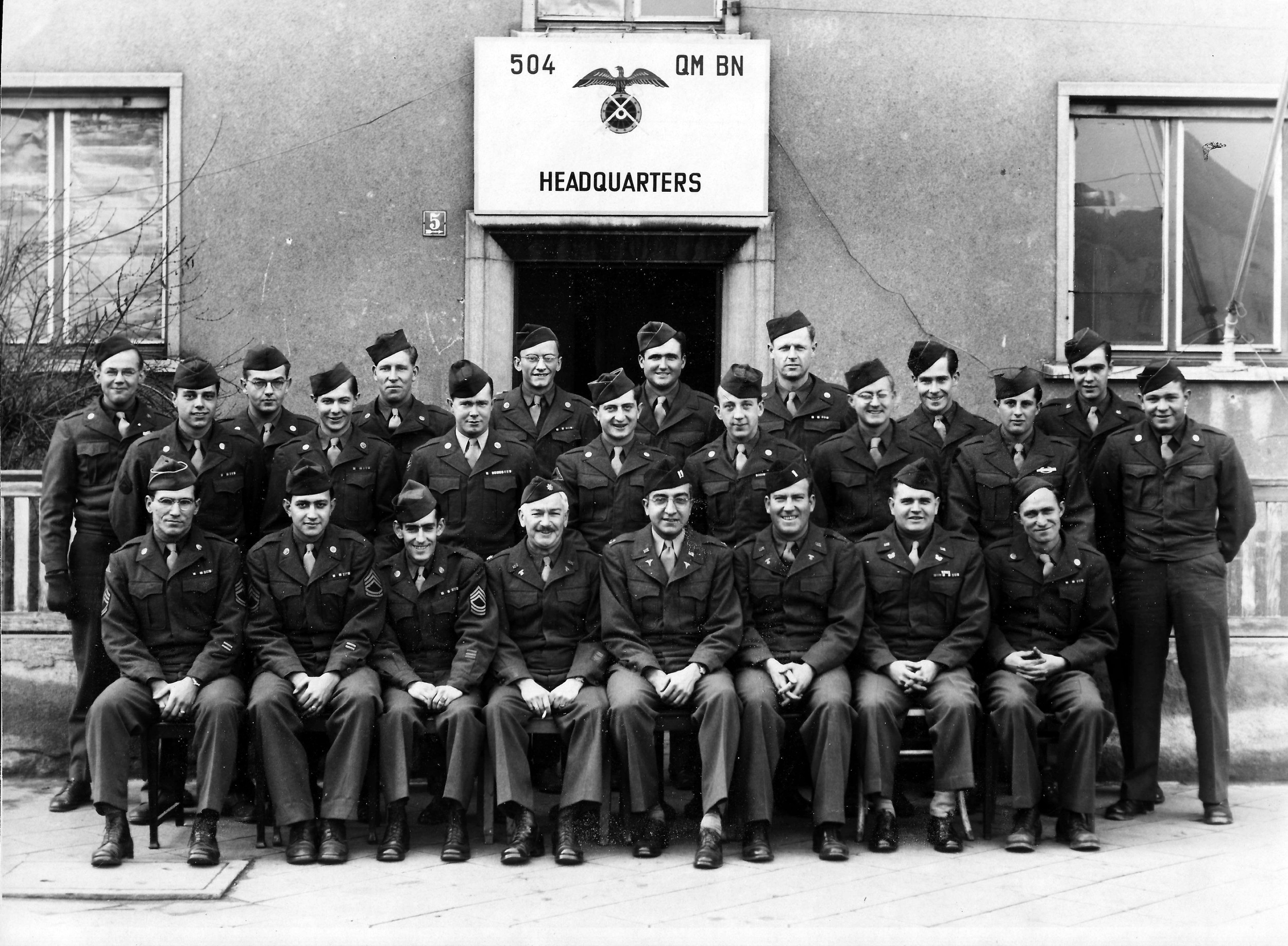 Sometime in November 1945, his battalion took this photo in Mannheim. He is the second from the left in the second row. Click for a larger version.