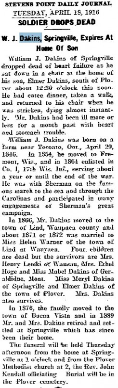 My wife’s 3rd-great-grandfather, William J Dakins, passed away on April 18, 1916. He participated in the Civil War with Company 1, 17th Wisconsin Infantry and according to his obituary below, “he was with Sherman on the famous march to the sea and through the Carolinas and participated in many engagements of Sherman’s great campaign.”