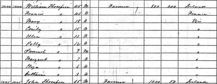 William Henry THOMPSON was born sometime between 1810 and 1816 in either Ireland, England, or Scotland, depending on which record you look at. In the 1870 Census of Morrison, Brown Co., Wisconsin, he is listed as being born in 1810 in England. On his headstone, the listing of his daughter in the 1905 Wisconsin State Census, and the Wisconsin Deaths and Burials, 1835-1968 entry, he was born in 1813 in Ireland. In the 1880 and 1860 Morrison, Brown Co., Wisconsin census records, he was born in 1816 in Ireland. Finally, in the 1850 Census of Granville, Milwaukee Co., Wisconsin and listed as his birthplace in entries for his daughter, Pauline (THOMPSON) FIRMENICH, he was born in 1816 in Scotland. Adding to the fact that the name William THOMPSON covered about 15 billion people back then, he has been a tough one to find.