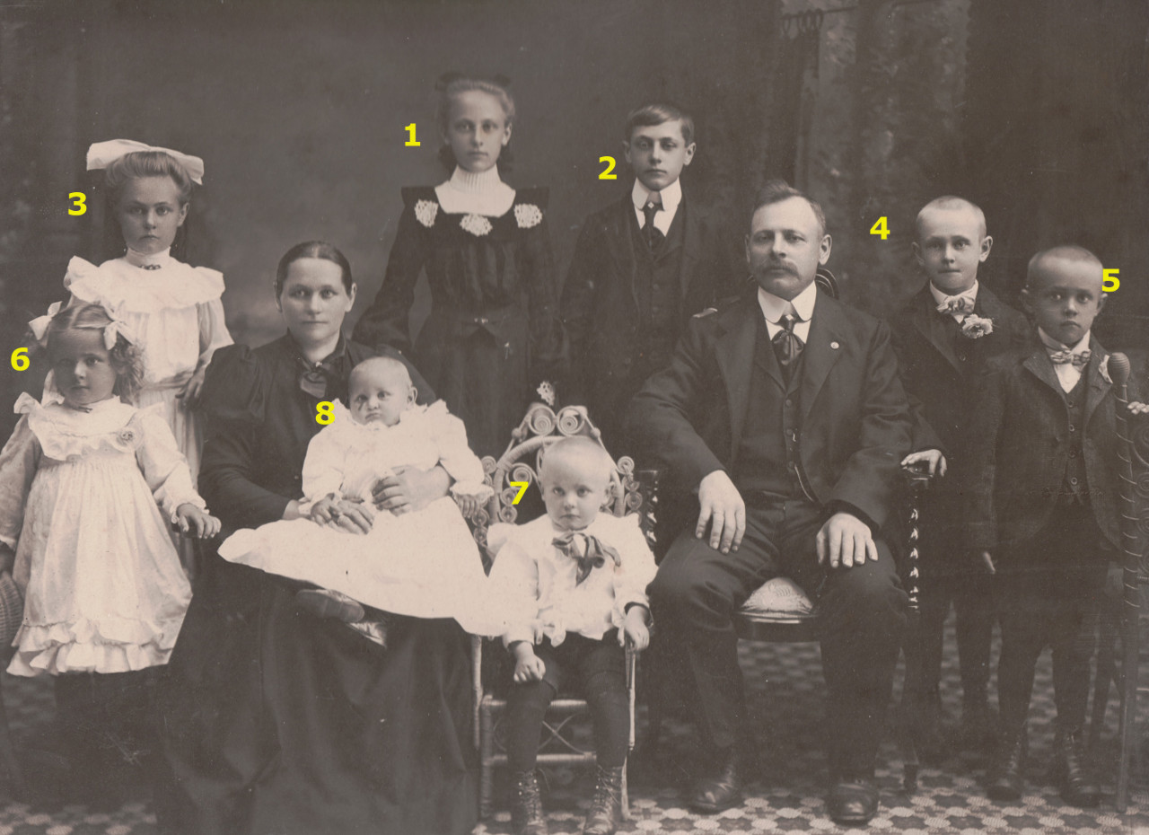 - The next 3 children either died not long after birth or at a date unknown, Bertha, Charles, and Freida (1893, 1894, 1897) so I assume they’re not in the photo based on this info.
