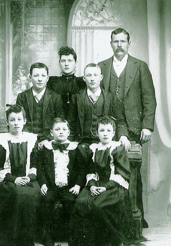 From what I figured out, this is my great-great-grandfather Thomas CORRIGAN and his first wife Ellen FERGUSON (1854- abt 1890.) I had originally tabbed it as Thomas Corrigan and his second wife, my great-great-grandmother Emma Jane FIRMENICH. Then one day I looked closer at it and at Tom and Emma’s children and they didn’t seem to match up. It occurred to me that this was probably his first family since the kids line up pretty well with their ages. Tom was a busy man. He had 5 children with Ellen and then married my gg-grandmother and had 9 more.