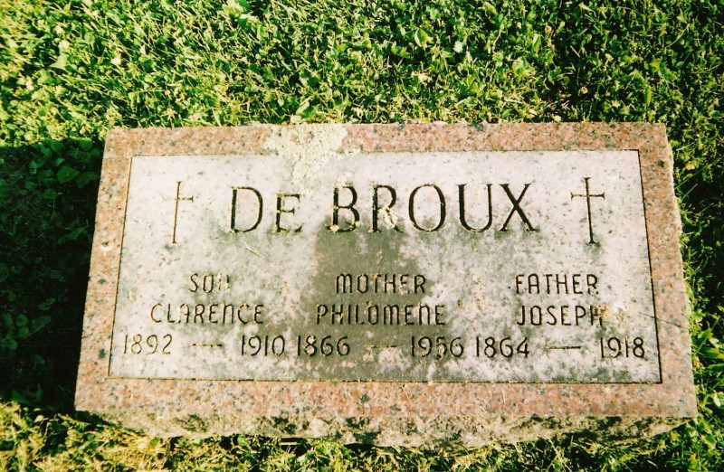 This weeks photo is that of my great-great-grandparents, Joseph & Mary Philomene (LAURENT) DEBROUX. The stone is located in St. Joseph’s Catholic Cemetery, Norwood, Langlade Co., Wisconsin. Joseph DEBROUX was born 1864 in Grand Chute, Outagamie Co., Wisconsin to Desire and Desiree DEBROUX. He married Philomene LAURENT on 8 Sep 1891 in Langlade Co. She was born 1866 in Wisconsin to Jean Baptiste LAURENT and Olivine Marie ST. LOUIS.