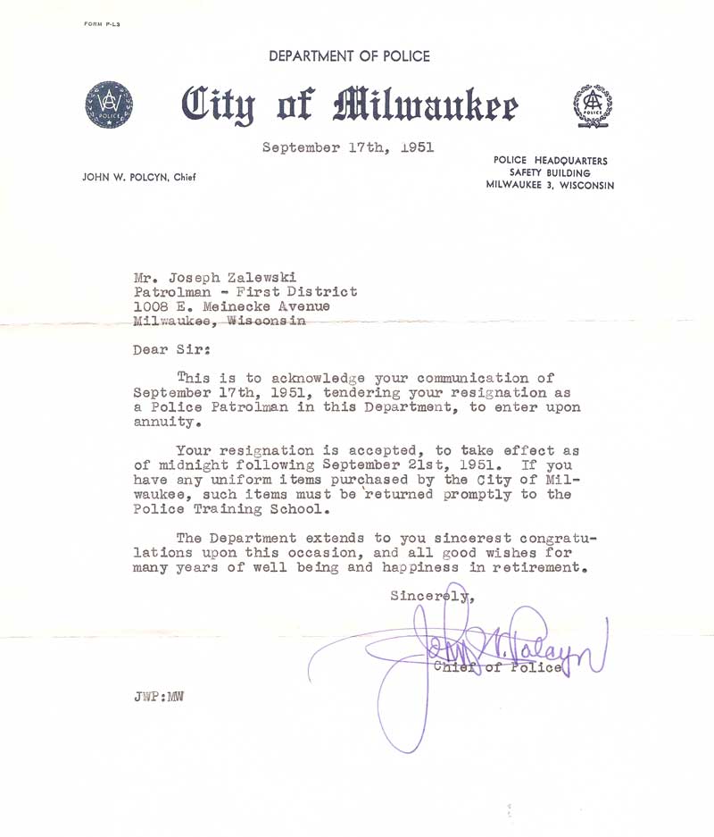 This is my great-grandfather, Joseph Zalewski’s, badge from when he was a Milwaukee Police Officer. He became a police officer on February 1, 1918 after returning from World War I. He served until he retired on September 21, 1951. In the recent collection of documents I received was a letter written to him from the Chief of Police about his resignation.