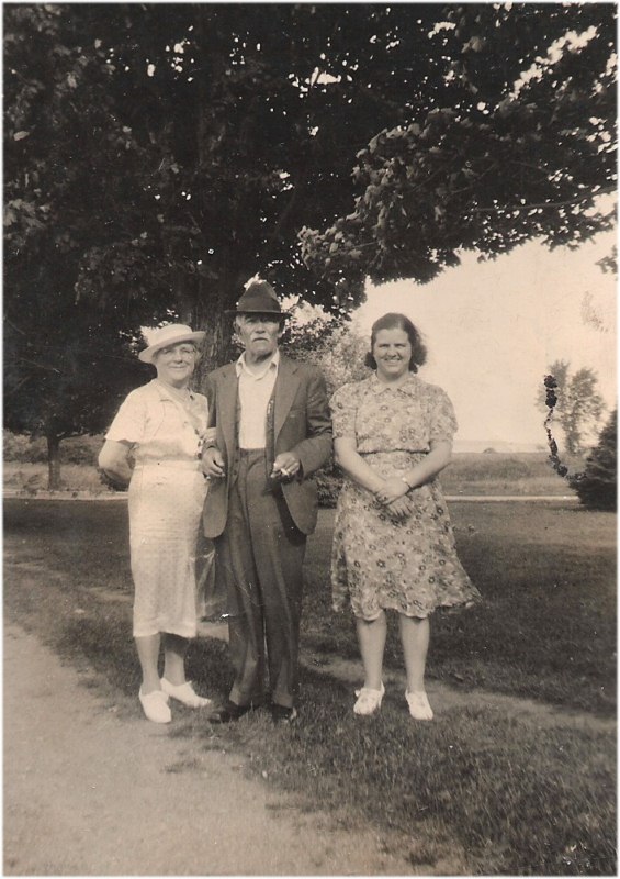 This is a photo from July 1940 of my great-great-grandmother, Emma Jane FIRMENICH, on the left with her 3rd husband, George Cook. On the right is my great-great-aunt, Sadie CORRIGAN.