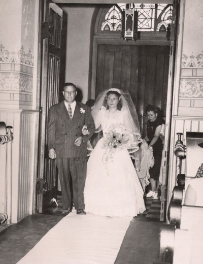 This is a photo from my grandmother’s, Marge (DEBROUX) THIELKE’s, wedding on August 28, 1948 in Port Washington, Ozaukee Co., Wisconsin. She is being walked down the aisle by her father, my great-grandfather, Leon DEBROUX. Click for a larger version.